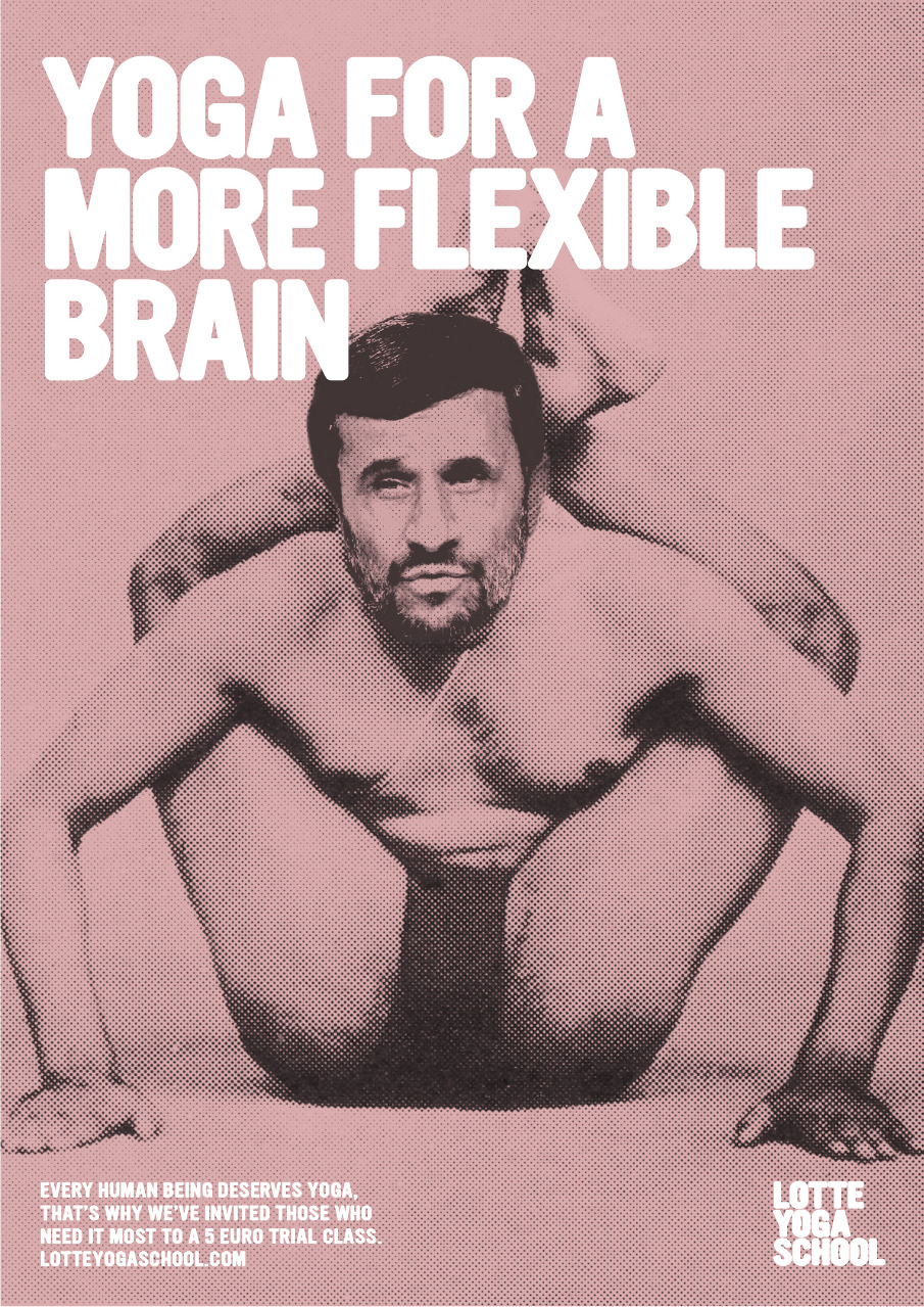 Project. Communications for a yoga school, focusing not on beauty but the practice’s core promise: becoming just a teeny bit nicer. To underscore this, the campaign picked world leaders most in need of a yoga lesson -- the bigots, the fundamentalists, and the flat-out racists. We even contacted their embassies to invite them to a free lesson. They weren’t interested.
